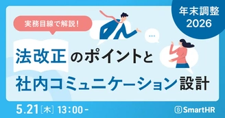 2026/04/15 次の入退社対応をもっと楽に!人事と情シスをつなぐアカウント管理と問い合わせ削減|月刊SmartHR2026年4月号 紹介機能 :ID管理AIアシスタント 月刊SmartHR 2026/04/15 2026/03/26 【人事向け・30分】新入社員とのやり取りをラクにするSmartHR活用法 問い合わせ・リマインド対応を減らし、オンボーディングをスムーズに 紹介機能 :従業員ポータルスマートフォン向けアプリメッセージ機能AIアシスタント従業員サーベイ 2026/03/26 2026/03/18 「あの人に聞かないとわからない」から脱却するキャリアデータの標準化|月刊SmartHR2026年3月号 紹介機能 :キャリア台帳スキル管理人事評価従業員サーベイ 月刊SmartHR 2026/03/18 2026/03/12 エンゲージメントサーベイ実践セミナー 形骸化させない設計・実施・活用の型 紹介機能 :従業員サーベイ 2026/03/12 2026/02/19 2026年4月からの「子ども・子育て支援金制度」に向けたSmartHR活用法|月刊SmartHR2026年2月号 紹介機能 :招待管理給与計算給与明細汎用申請AIアシスタント従業員情報申請ID管理SmartHR Plus従業員ポータル 月刊SmartHR 2026/02/19 2026/02/18 【デモで解説】評価から給与決定まで一気通貫!「給与シミュレーション」機能解説セミナー 紹介機能 :人事評価 2026/02/18