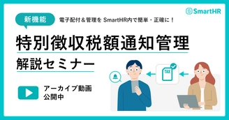 新機能「特別徴収税額通知管理」解説セミナー 〜電子配付&管理をSmartHR内で簡単・正確に!〜 紹介機能 :特別徴収税額通知管理 2025/11/27 次の入退社対応をもっと楽に!人事と情シスをつなぐアカウント管理と問い合わせ削減|月刊SmartHR2026年4月号 紹介機能 :ID管理AIアシスタント 月刊SmartHR 2026/04/15