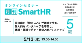 エンゲージメントサーベイ実践セミナー 形骸化させない設計・実施・活用の型 紹介機能 :従業員サーベイ 2026/03/12 【人事向け・30分】新入社員とのやり取りをラクにするSmartHR活用法 問い合わせ・リマインド対応を減らし、オンボーディングをスムーズに 紹介機能 :従業員ポータルスマートフォン向けアプリメッセージ機能AIアシスタント従業員サーベイ 2026/03/26 次の入退社対応をもっと楽に!人事と情シスをつなぐアカウント管理と問い合わせ削減|月刊SmartHR2026年4月号 紹介機能 :ID管理AIアシスタント 月刊SmartHR 2026/04/15