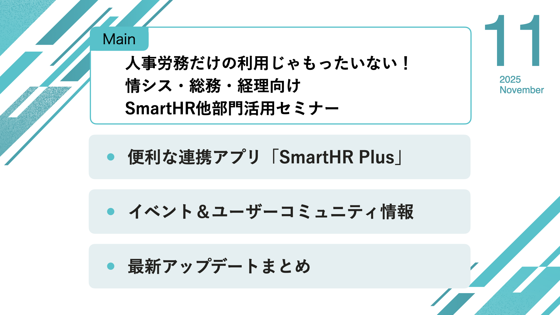 月刊SmartHR11月号では、従業員ポータルを軸に、情シス・総務・経理それぞれの業務で、SmartHRをどう活用できるか、各部署ごとのユースケースも交えてご紹介します。